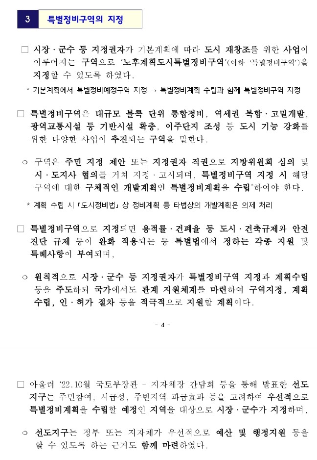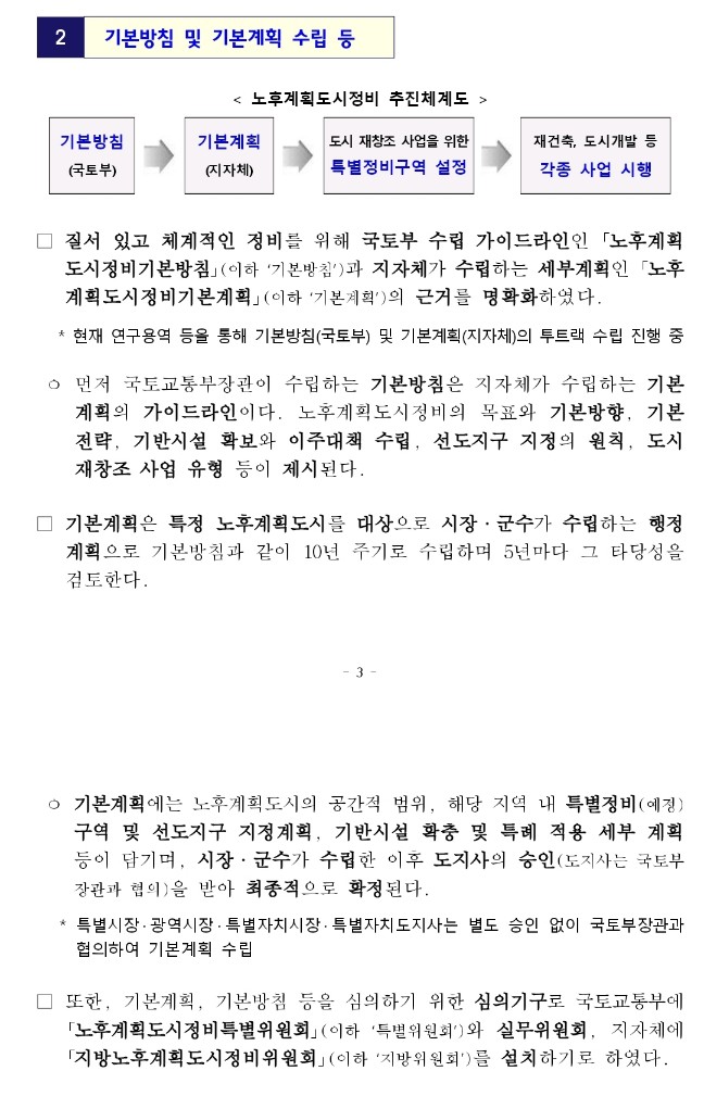 국토부의 기본방침에서 목표와 기본 방향, 기본 전략, 기반시설, 이주대책, 선도지구 지정 원칙, 도시 재창조 사업 유형 등에 대한 가이드라인을 제시하고 이 방침을 토대로 지자체에서 노후계획도시의 범위, 특별계획구역 및 선도지구 지정, 기반시설 확충 및 특례적용 세부 내용 등이 담긴 기본계획을 수립하게 됩니다.