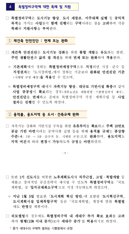 - 용적률, 용도지역 상향 등 도시건축규제 완화(용적률 규제를 종상향 수준 예를 들면, 2종에서 3종 또는 준주거 수준으로 상향예정인데 기존 용적률에서 1단계 또는 2단계로 대폭 상향될 예정입니다)