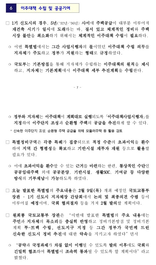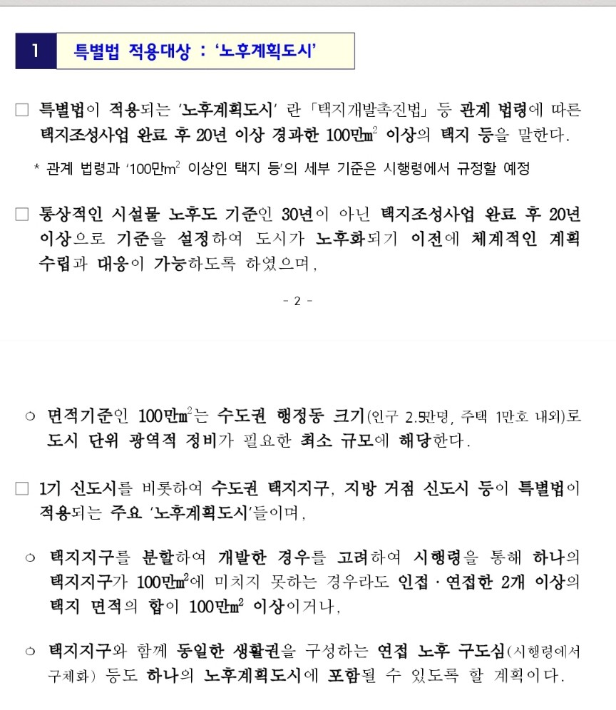 택지조성 후 20년 이상 경과한 100만 m 2 이상의 택지를 대상으로 하고 있는데 아무래도 정부 입장에서는 1기 신도시만 포함시킬 경우 특혜논란이 있을 수 있기 때문에 수도권 택지지구, 지방거점 신도시 등 전국단위로 해당 요건을 갖추면 해택을 받을 수 있도록 입법을 준비 중인 것 같습니다. 세부사항은 시행령에서 규정될 예정이므로 추이를 지켜봐야 할 것 같습니다.